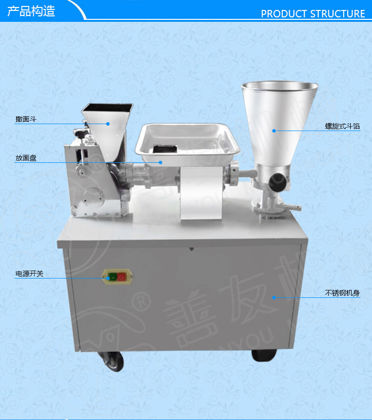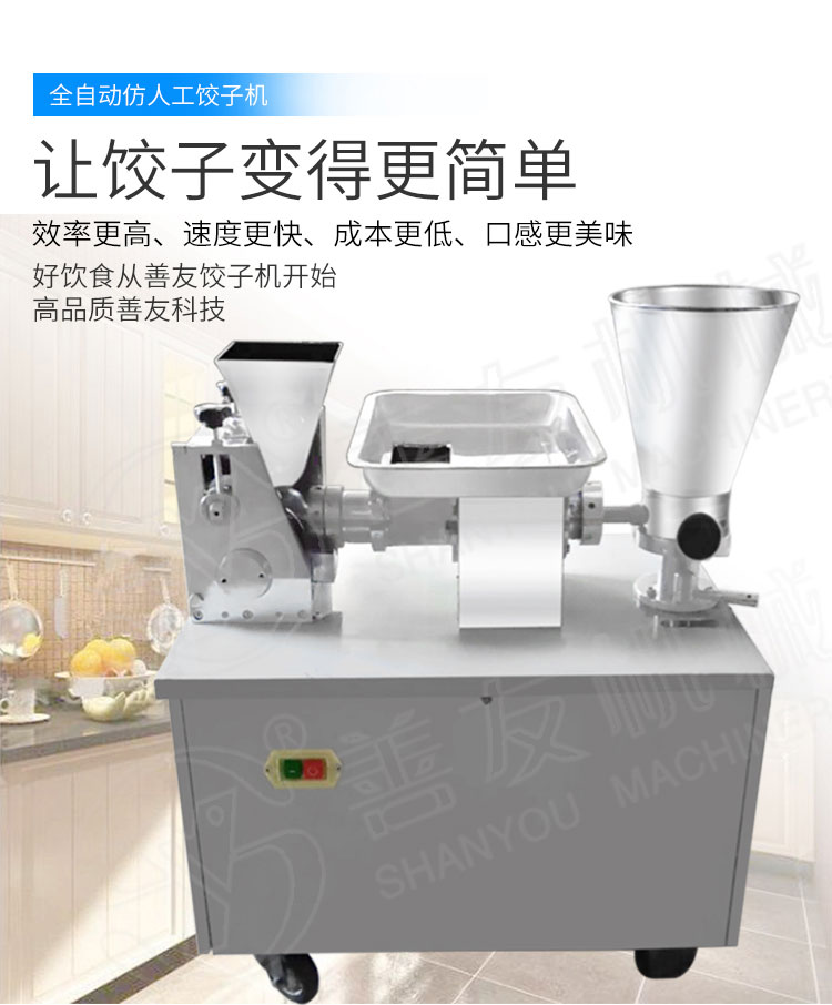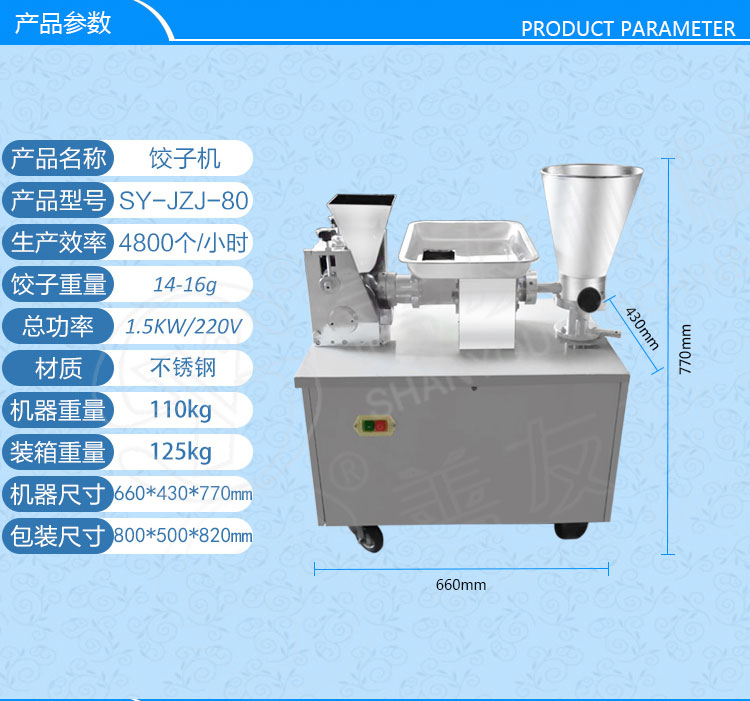 1、 一机多用途:只要更换模具,就可以制造不同的食品:春卷、馄饨、火锅水饺、珍珠水饺、咖喱饺子、花边饺子、锅帖饺子。